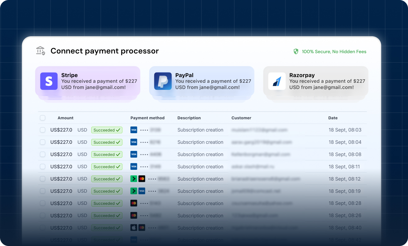 We make getting paid simple and flexible! DropCourse integrates with major payment providers such as Stripe, PayPal, and RazorPay. Once connected, all your payments are processed seamlessly, allowing you to focus on growing your business.