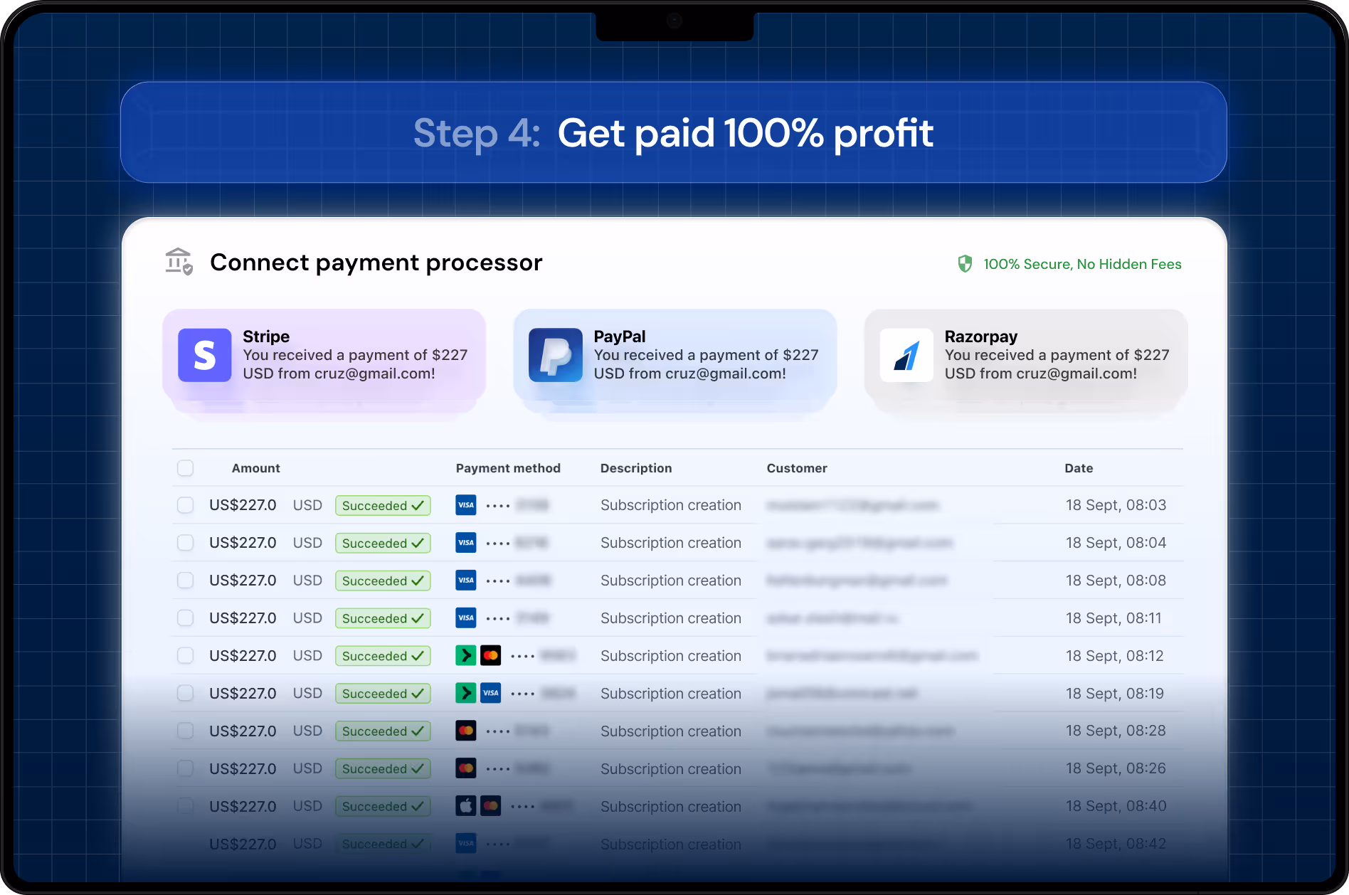 In just a few clicks, start processing payments securely through Stripe, PayPal, Square and more. Plus, you take home 100% profit on every sales. No hidden fees.